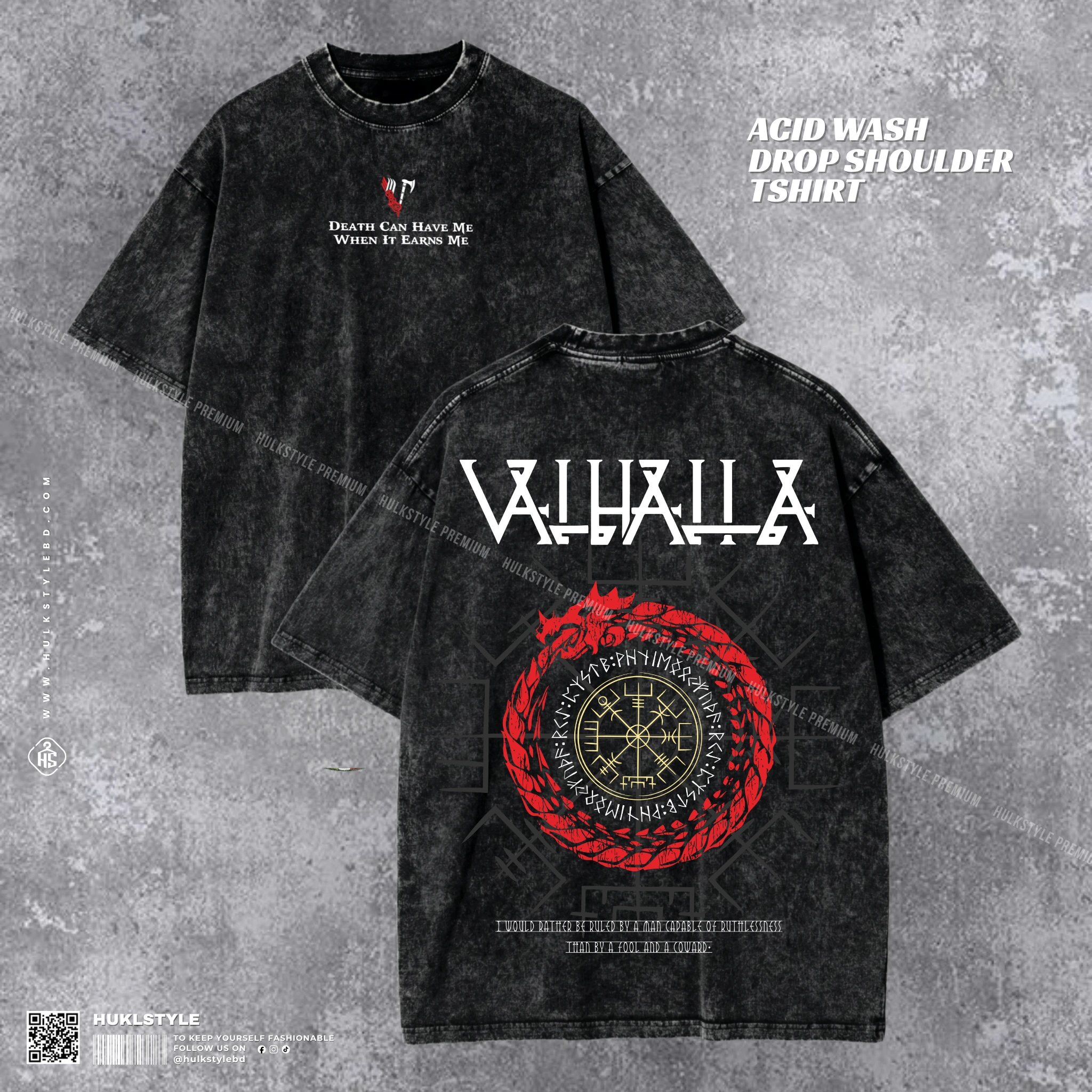 Valhalla Acid Wash T-shirt | Viking Graphic Drop Shoulder | HulkstyleBD