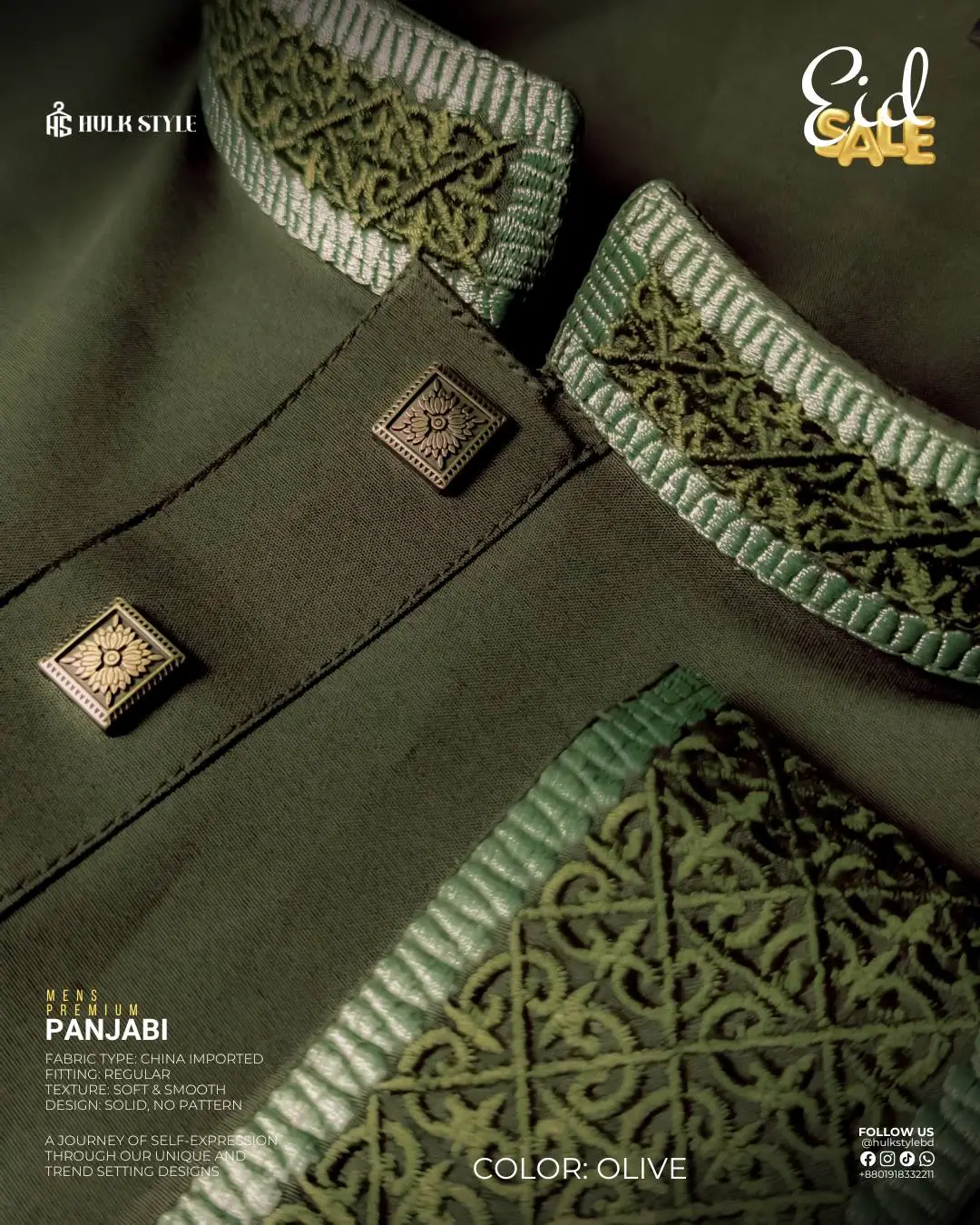 To complete your look, we recommend pairing this panjabi for men with contrasting white or off-white pajamas. For a more contemporary “Hulkstyle” vibe, many of our customers style their panjabi design with slim-fit trousers or premium loafers. Because of the snap buttons and embroidered cuffs, you don’t need heavy accessories—the garment is the statement piece.
