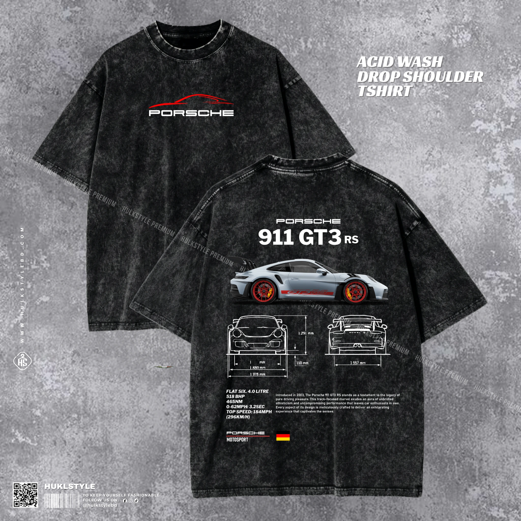 Be the first to review “Porsche 911 GT3 RS Acid Wash T-shirt | Weissach Aero Drop Shoulder | HulkstyleBD” Cancel reply