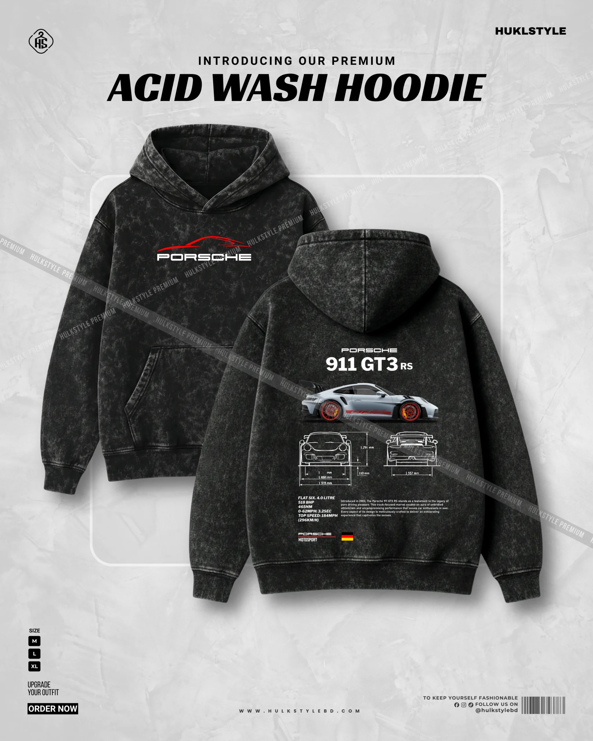 Premium Acid Wash Hoodie with Porsche 911 GT3 RS Blueprint Graphic
